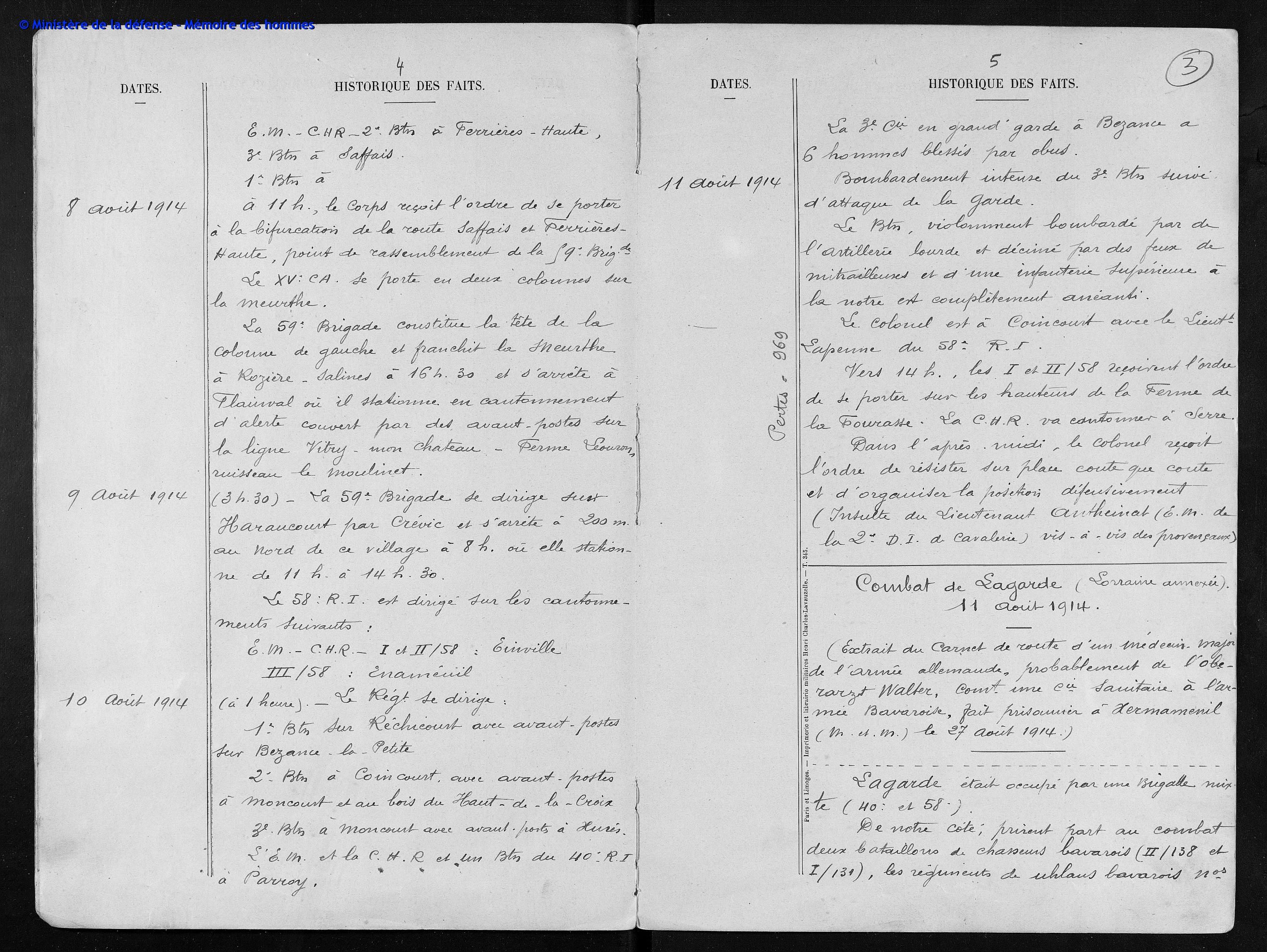 3Certains noms sont entre parenthèses? C’est le 3ème Bat. qui mène l’attaque le 10 août de 11h à 21h00, Lagarde est pris, peu de blessés. Une partie du régiment (dont le 2ème Bat.) est à Coincourt. Des éléments sont aux avant-postes dans le bois du Haut de la Croix (environ 1 km au Nord de Lagarde).