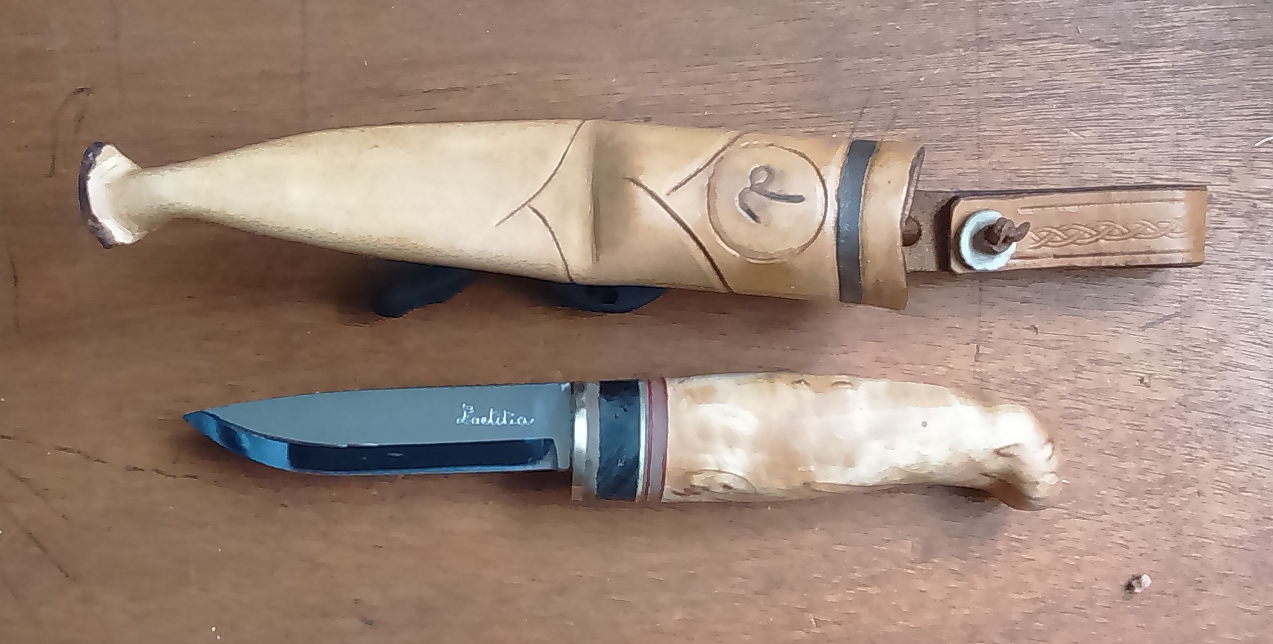 La poignée est en Amarante (bois d’Amérique du Sud) avec un intercalaire blanc. Le tout est collé à l’époxy et riveté avec deux rivets mosaïques et un rivet Loveless.