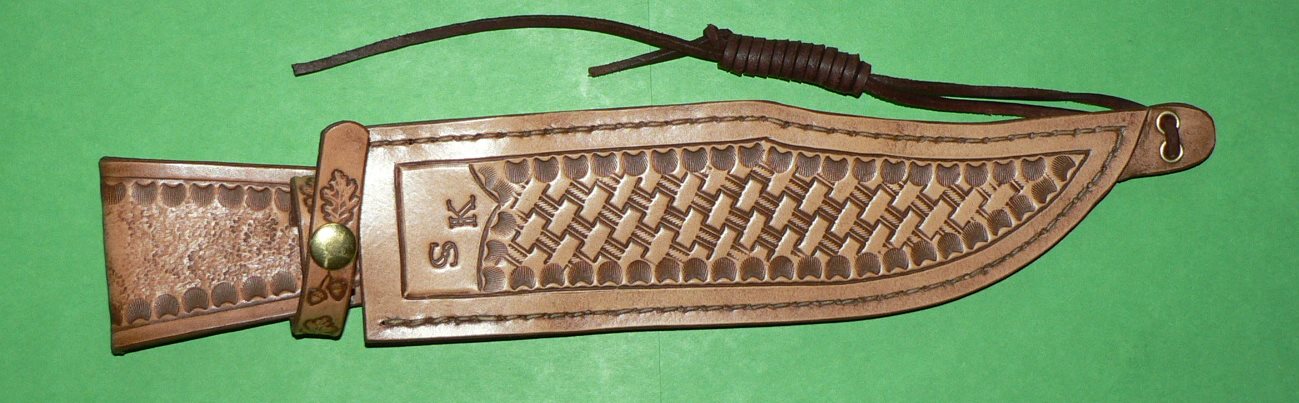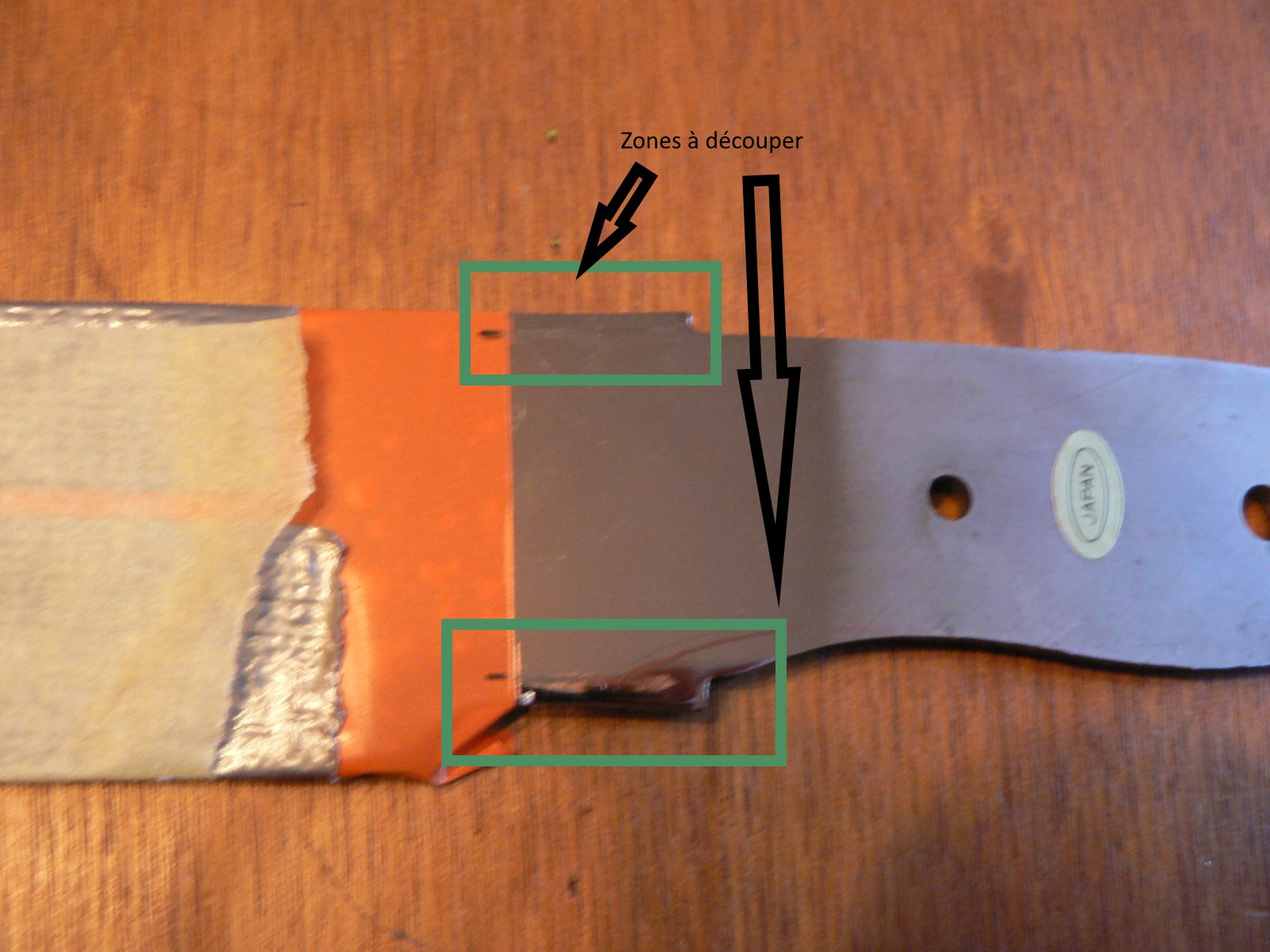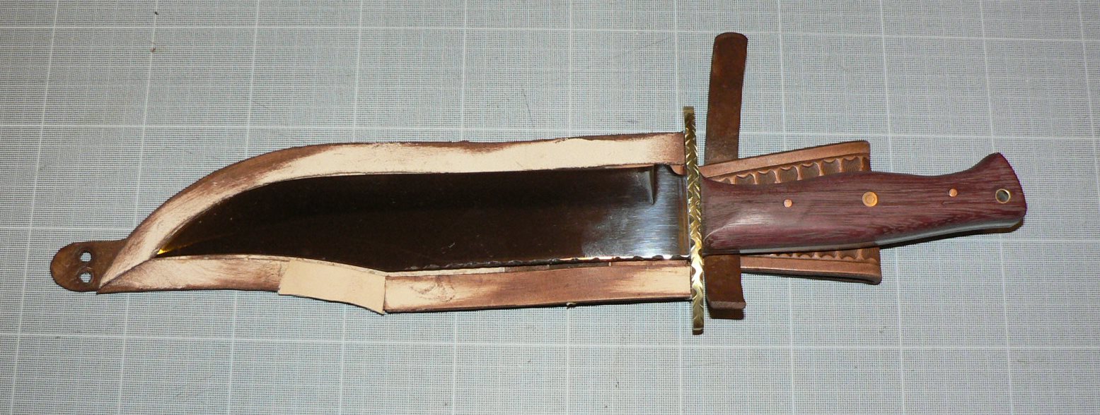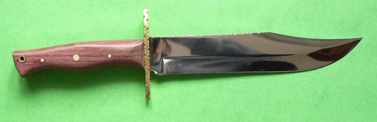 Je viens de réaliser un nouveau Bowie à partir d’une lame industrielle en 440C fabriquée au Japon, ce pays est réputé pour la qualité de ces aciers. J’ai déjà travaillé ce modèle de lame qui est particulièrement élégant malgré sa taille imposante (38 cm pour un tranchant de 23 cm). Bien sûr je la customise chaque fois d’une façon différente, ce qui fait que chaque couteau est unique. J’ai reconnu ce modèle de lame sur des sites de vente, les vendeurs prétendent l’avoir réalisé eux-mêmes mais le design permet de l’identifier. Je pense qu’il faut être honnête est dire ce qu’on fait ou qu’on ne fait pas…